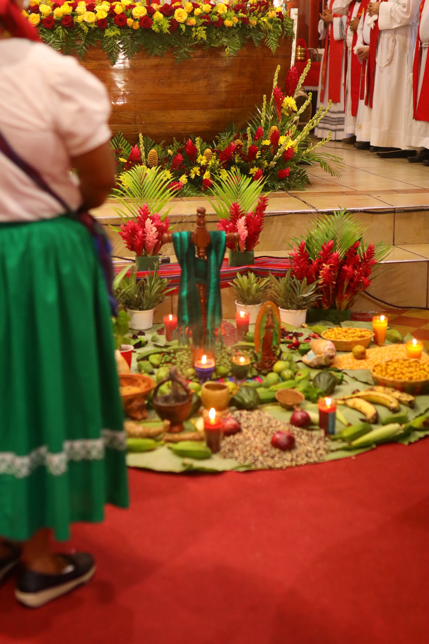 Durante las ofrendas se ora hacia los puntos cardinales; Oriente, color rojo, se reza por el nacimiento del sol y por los mártires que murieron por la fe. Poniente, color morado o negro; se reza por el descanso y la muerte, se ora por los abuelos y abuelas que ya partieron y por la esperanza en la vida eterna. Norte, color blanco: simboliza la sabiduría y lo espiritual; se ora por la salud, por la purificación del aire y la naturaleza y contra las enfermedades y la contaminación. Sur, color amarillo representa las cosechas y la fertilidad; se ora por la abundancia, la fecundidad de las mujeres, la lluvia y el equilibrio de la naturaleza. Color verde y azul están ubicados en el centro; simboliza el origen de todo lo creado. El azul representa el cielo y el cosmos; el verde, la madre naturaleza. Aquí se une lo divino y lo humano, el inmenso amor de Dios manifestado en la creación: EL CORAZÓN DEL CIELO Y DE LA TIERRA. El altar se decora con frutas, verduras, granos, flores y elementos que evocan la abundancia y belleza de la creación.
